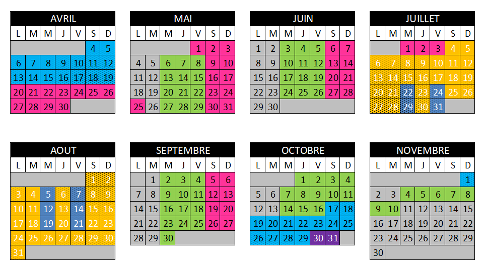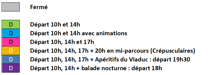 Retrouvez ci-dessous le calendrier avec les jours d’ouverture, les horaires de départ et les événements.